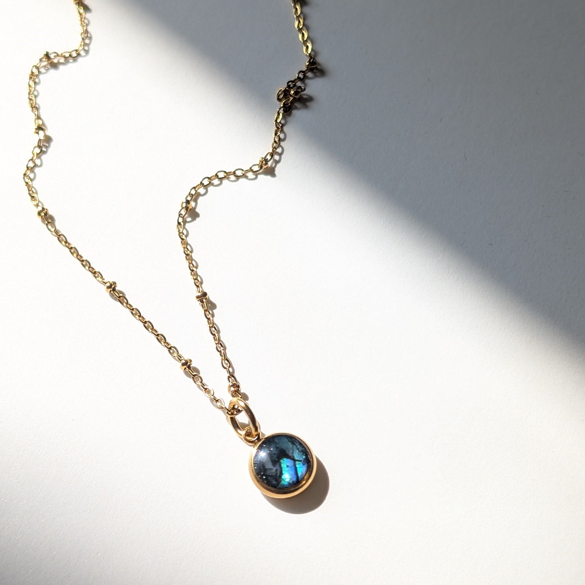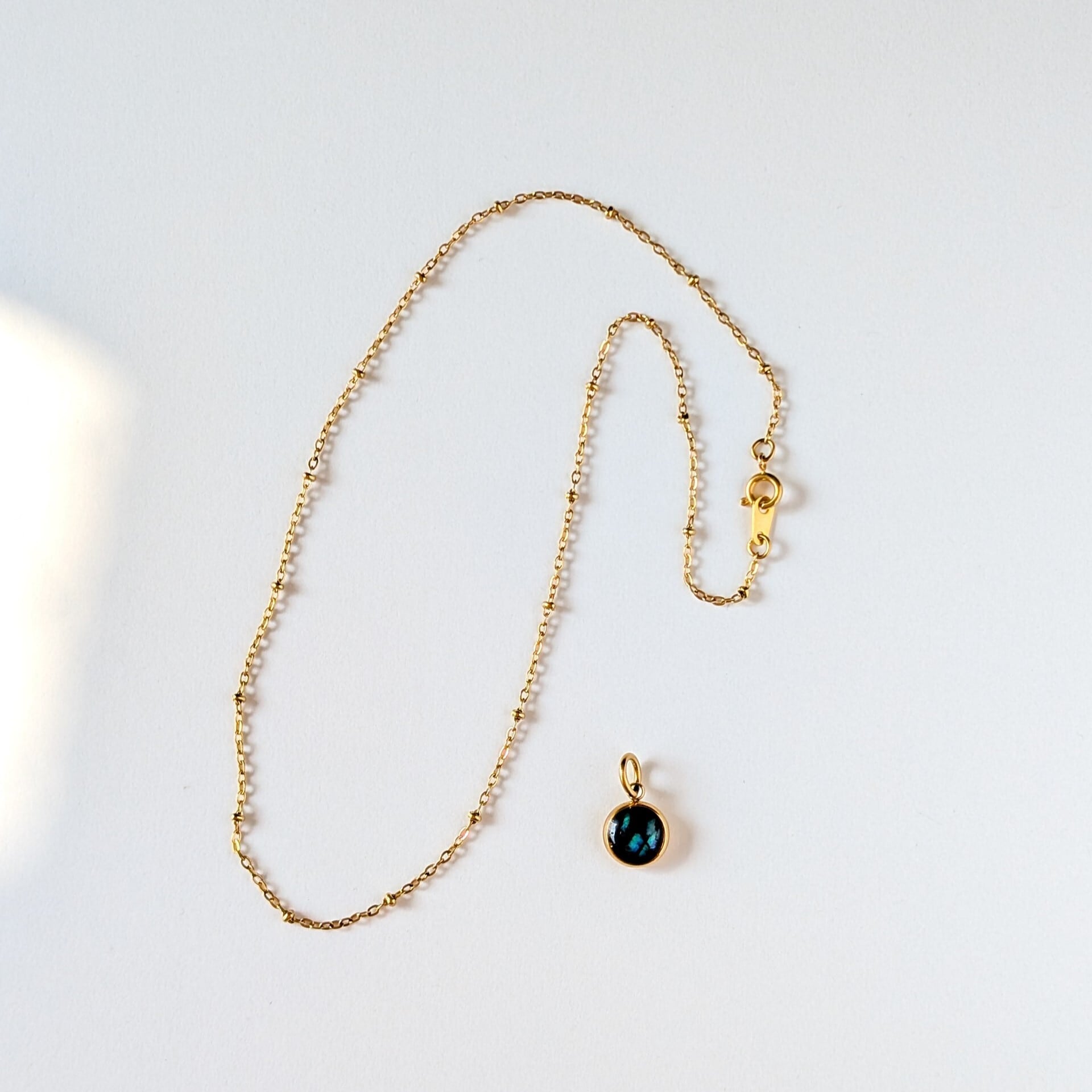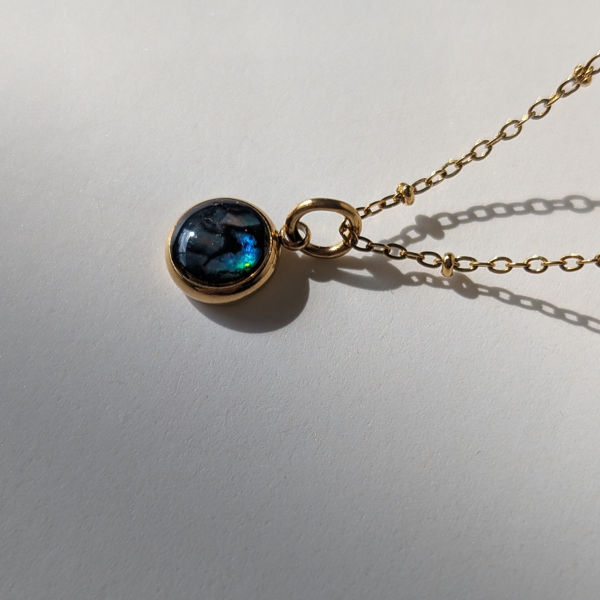 独特な虹色の輝きが魅力です。ミール皿を含めると10㎜ほどの大きさ。小振りですが、存在感を放ちます。チェーンの種類が選べます(写真は1.5㎜ドットチェーンです)