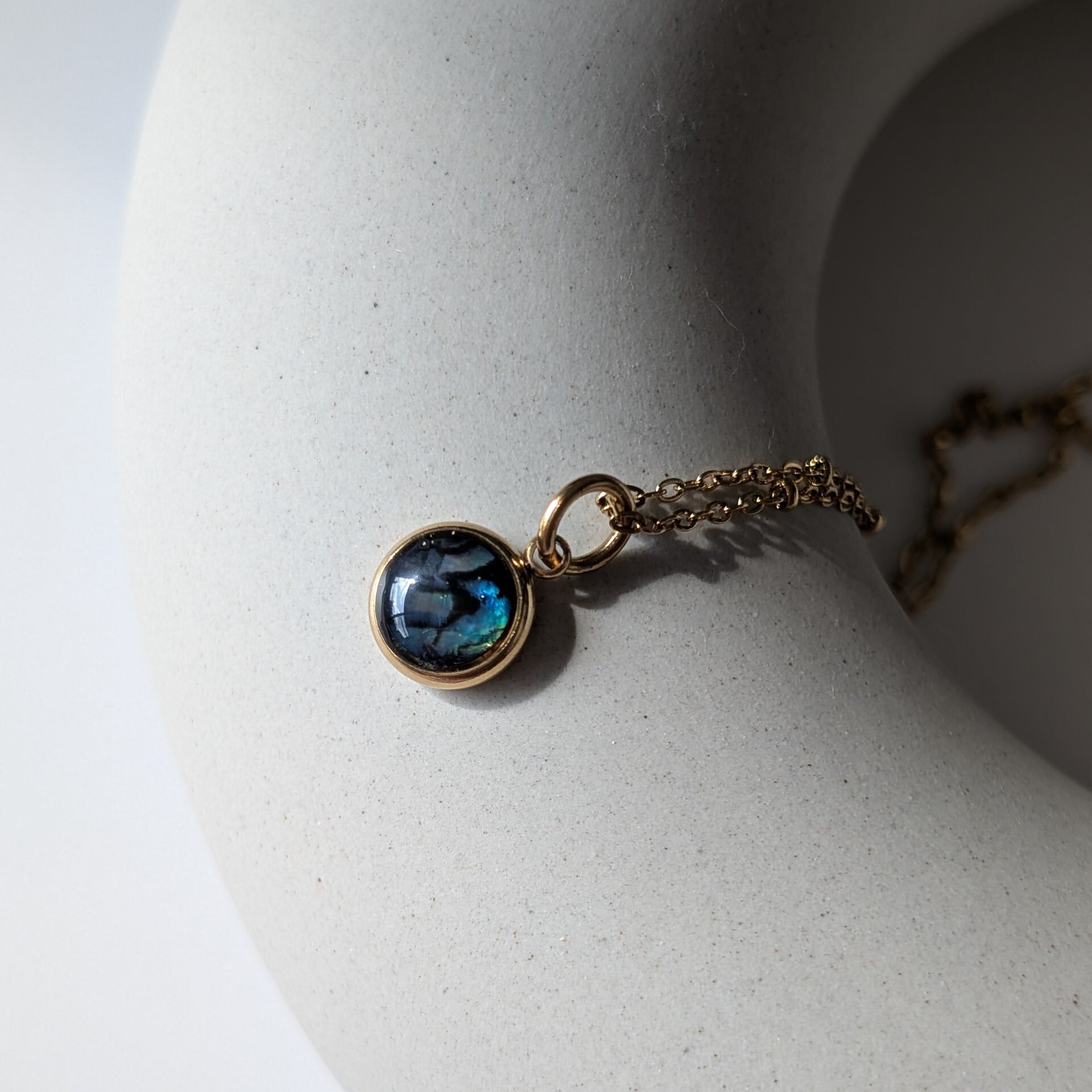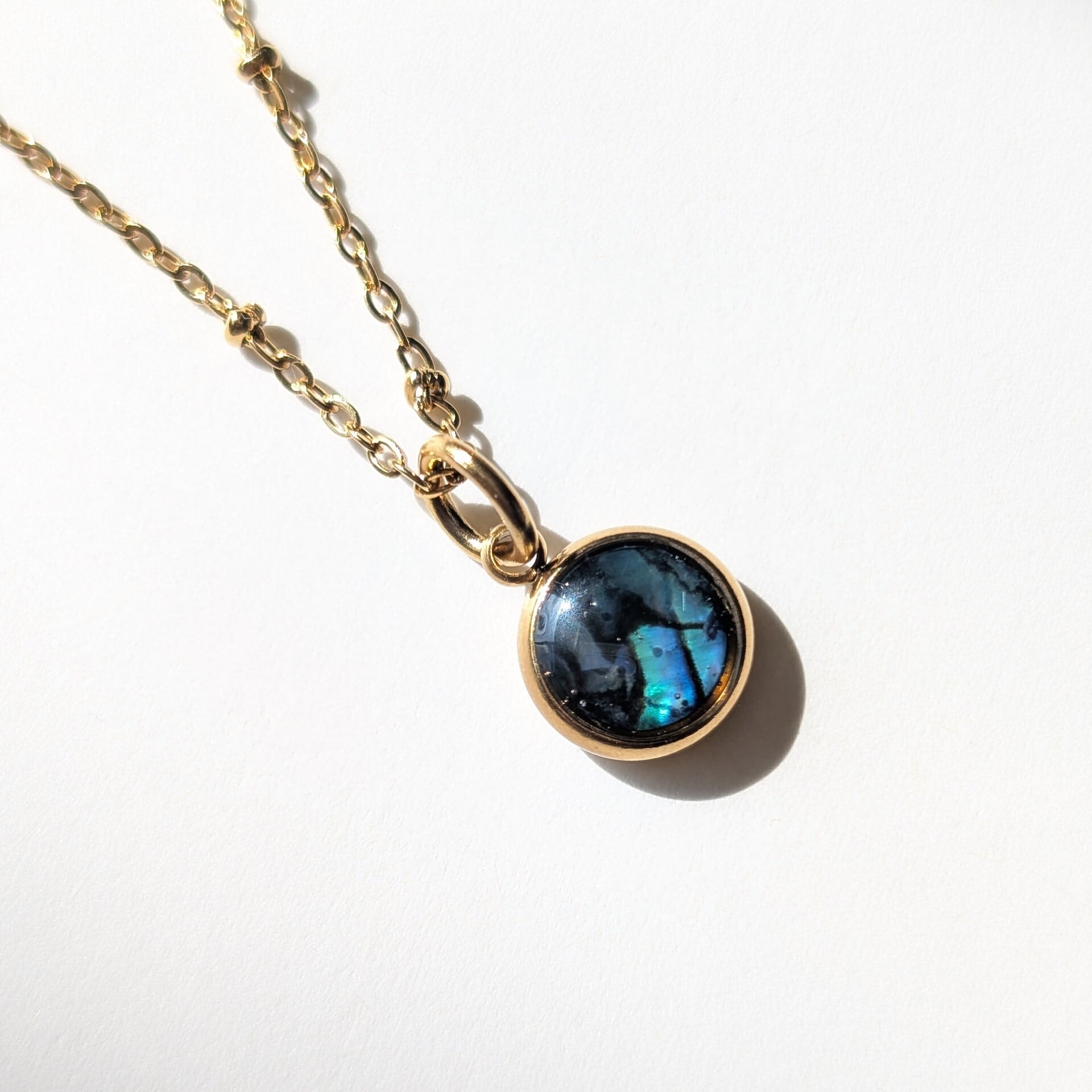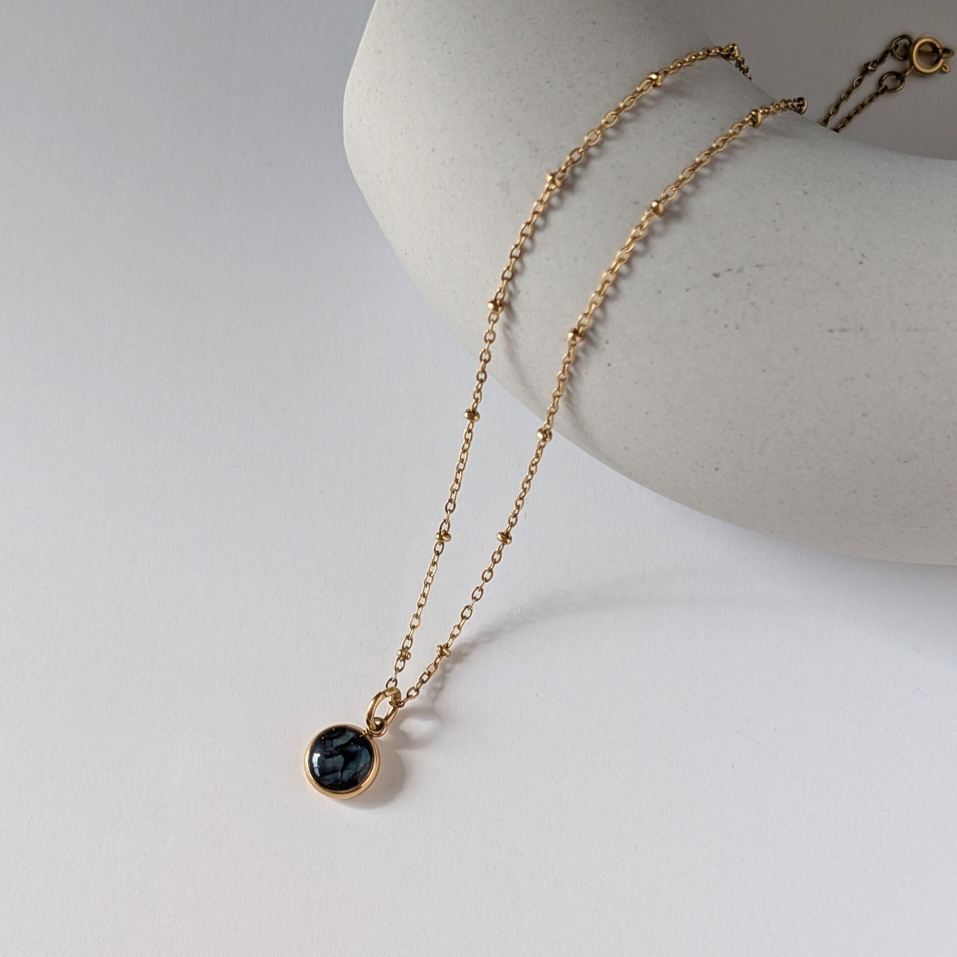 独特な虹色の輝きが魅力です。ミール皿を含めると10㎜ほどの大きさ。小振りですが、存在感を放ちます。チェーンの種類が選べます(写真は1.5㎜ドットチェーンです)